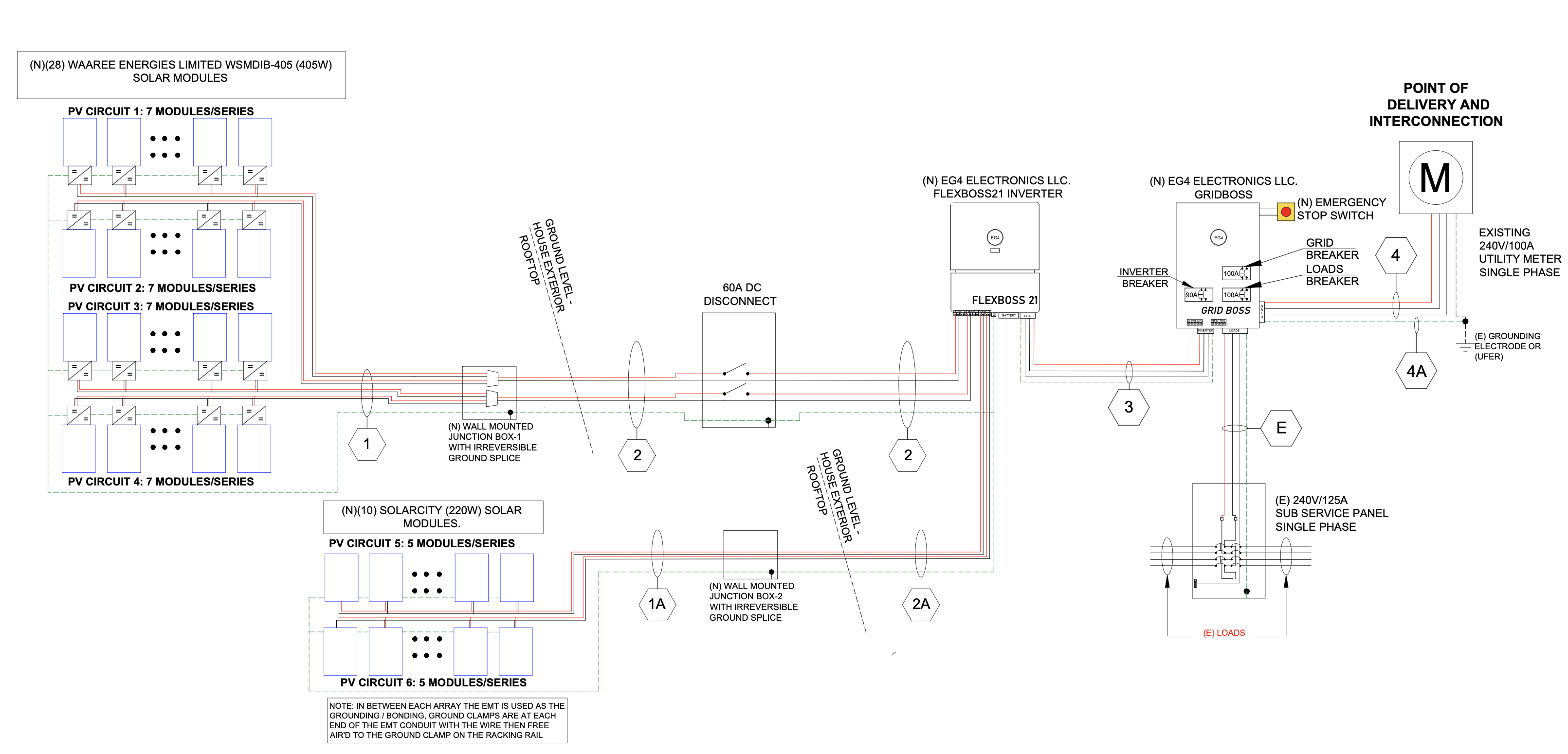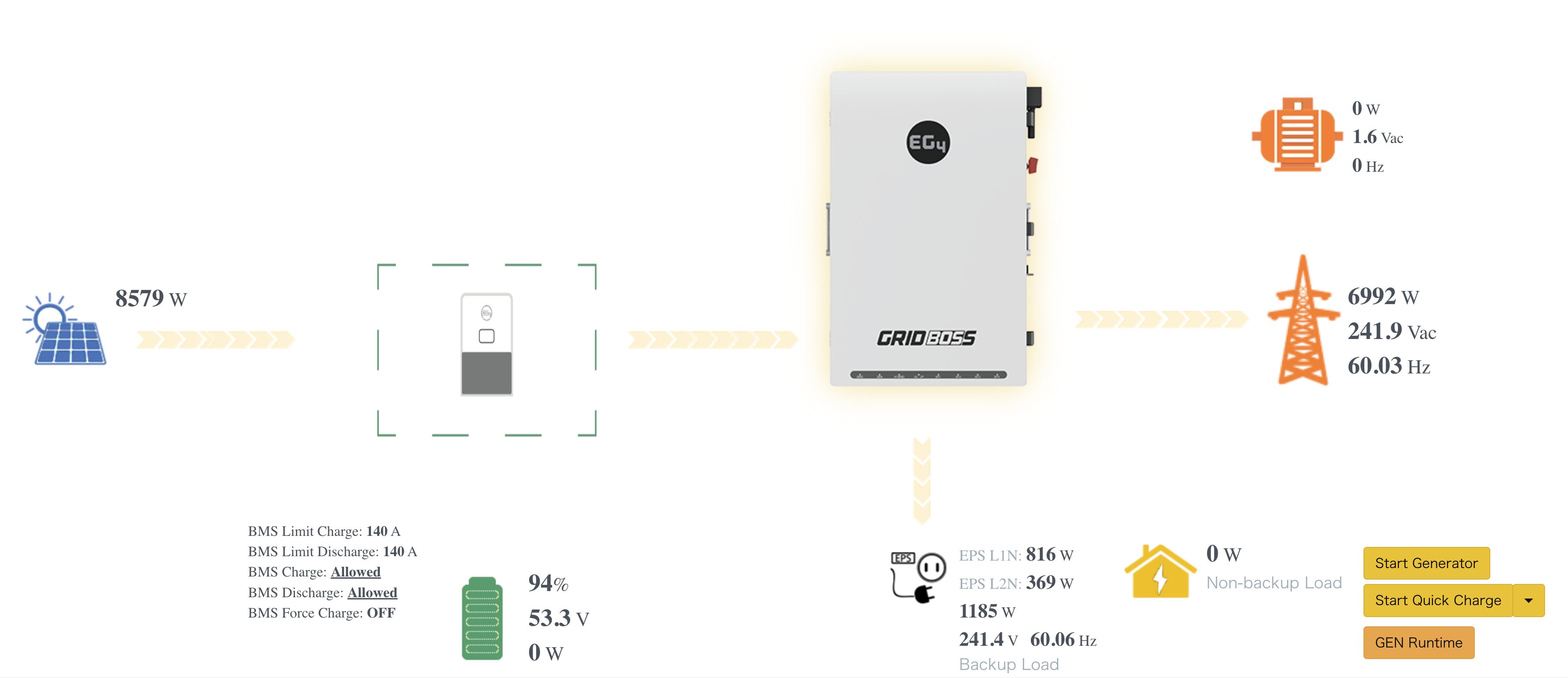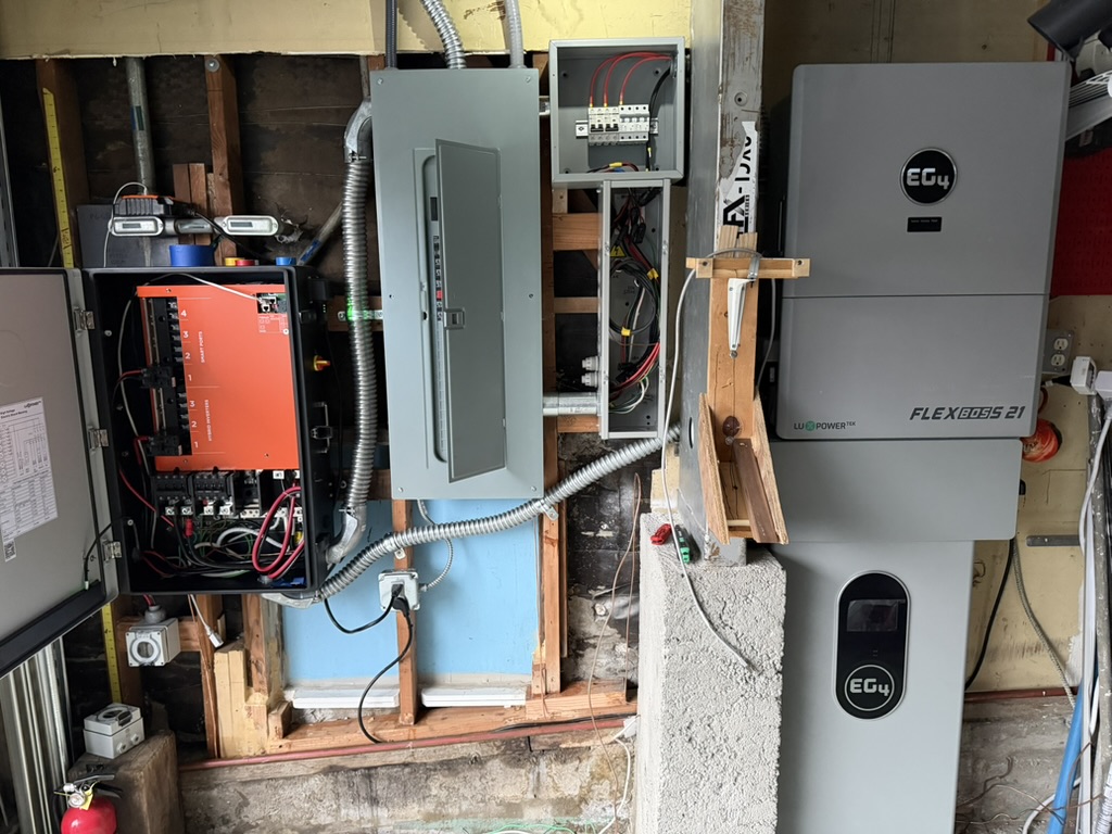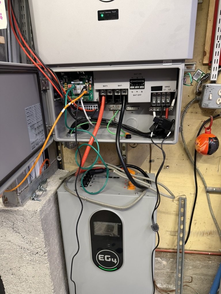 - 46kwh total LiFePo4 Battery Storage ([EG4 14.3kwh](https://eg4electronics.com/wp-content/uploads/2024/04/EG4%C2%AE-Indoor-280Ah-Battery-Quick-Start-Guide.pdf) + [Docan Panda 32kwh](https://www.docantech.com/lifepo4-battery-pack/us-stock-docan-panda-32kwh-lifepo4-battery-packs-with-200a-wifi-bms-touch-screen))