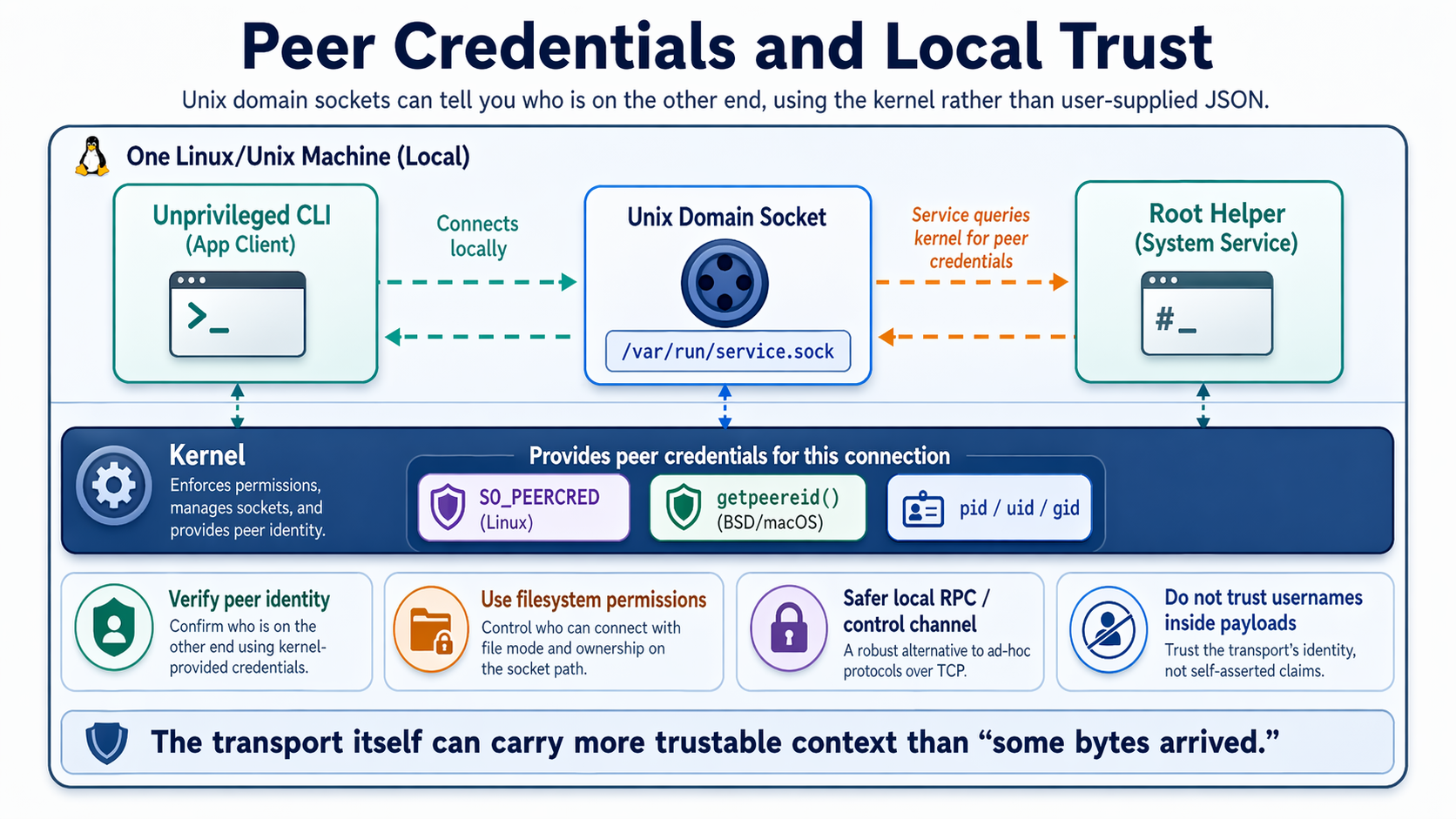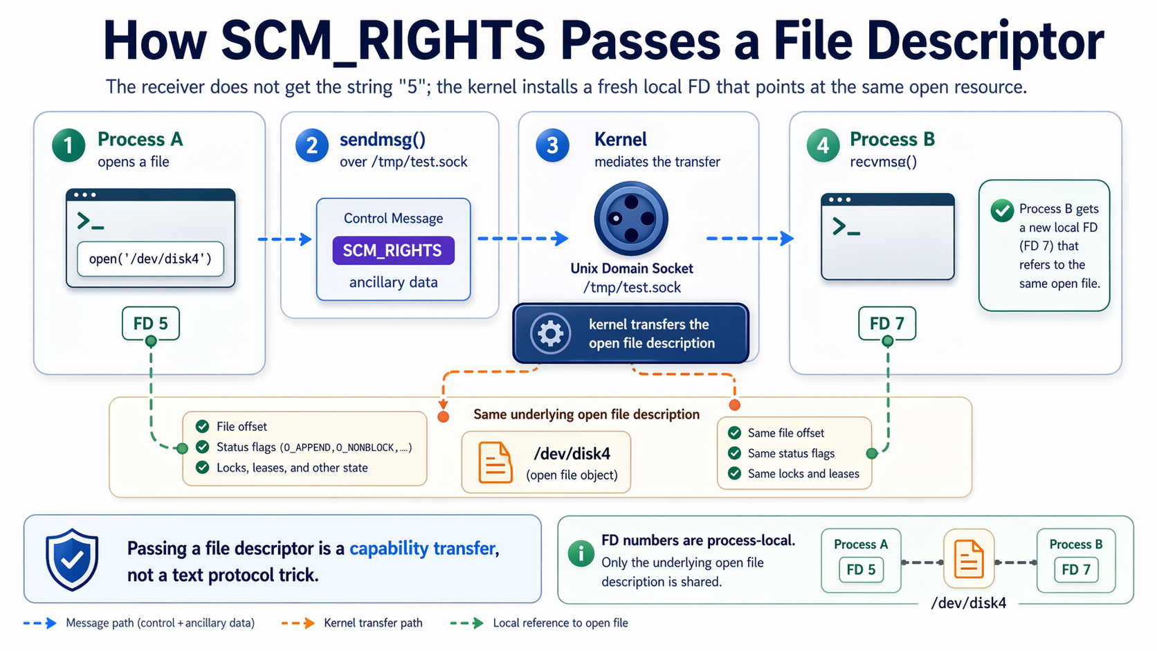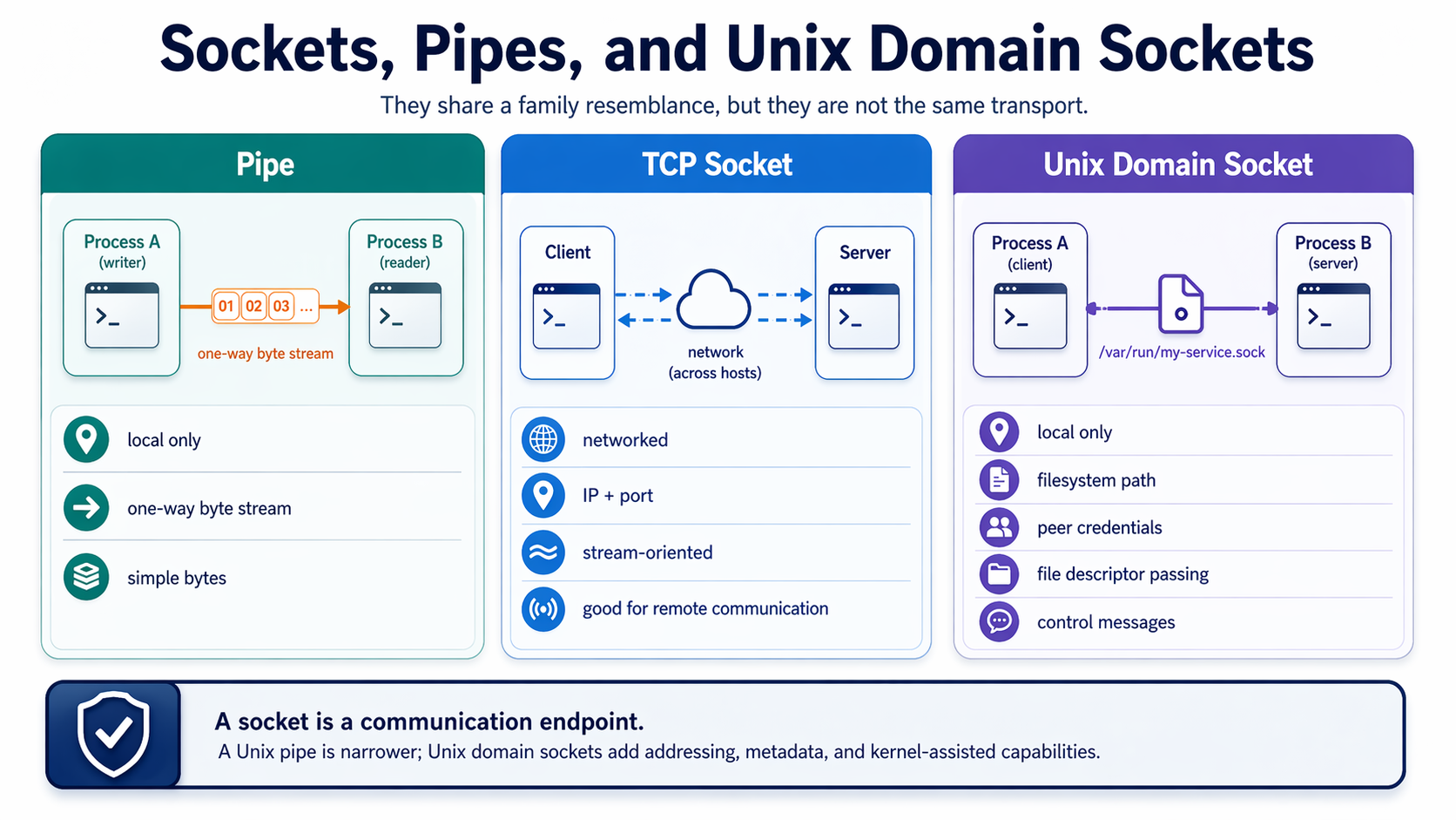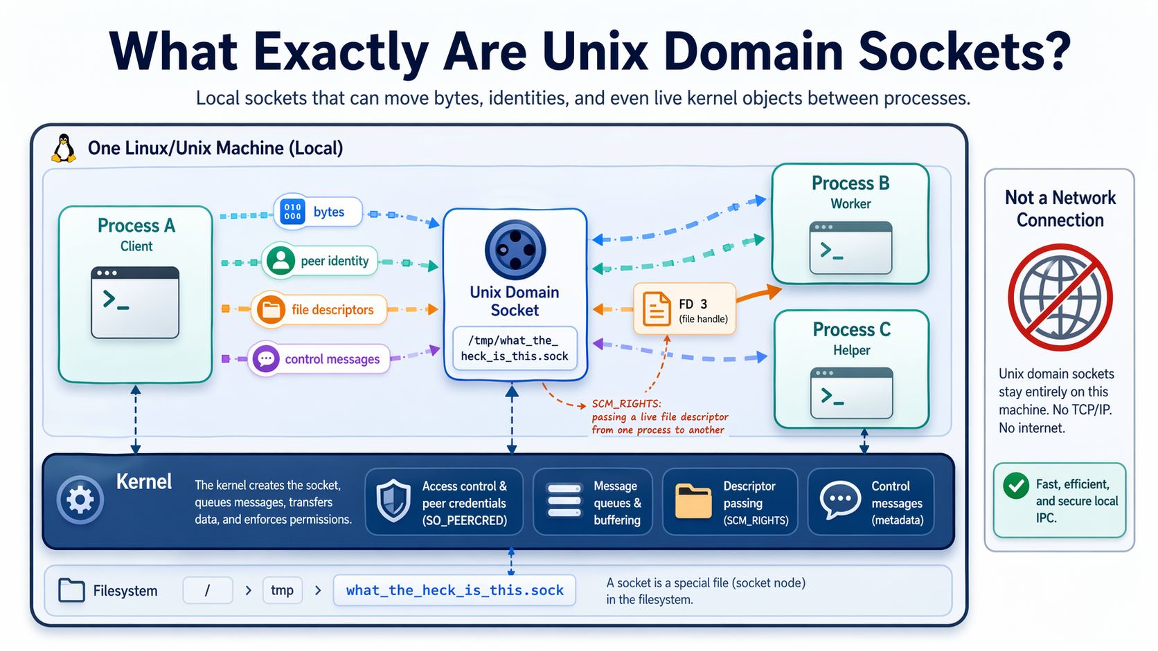 <center> # 🧦 What Exactly Are Unix Domain Sockets? *Originally published 2026-04-23 by Nick Sweeting on [docs.sweeting.me/s/blog](https://docs.sweeting.me/s/blog).* `/tmp/what_the_heck_is_this.sock` **Contrary to common belief, sockets are not just pipes for strings, they have lots of other powers on Unix systems.** <small>They can move bytes, identities, and even live kernel objects between processes.</small> </center> --- Most programmers first encounter sockets through TCP, and come away with a very simple mental model: open a connection, send some text, receive some text back. That model is fine for getting started, but it misses a big chunk of what unix sockets can do. On Unix systems, sockets are not just dumb string tubes. They are a general-purpose IPC and networking primitive with a bunch of special powers layered on top. Some of those powers are obscure. Some are ancient. Some are quietly running half of your operating system right now. <img src="https://docs.monadical.com/uploads/859bffed-0835-4464-bb7c-292ca211d5e4.png" width="150px" style="float:right"/> In particular, [Unix domain sockets (UDS)](https://man7.org/linux/man-pages/man7/unix.7.html) can do things a normal pipe cannot do at all, like: - identify the process on the other end - transfer open file descriptors between processes, even when owned by other users - act as a local RPC/control channel between privileged and unprivileged components - carry out-of-band control options for the kernel alongside normal payload data That last one is the part that tends to surprise people the most. > In the process of contributing [`/dev/diskN` block-device mounting support](https://github.com/lima-vm/lima/pull/4866) to Lima, I did a deep-dive and finally learned how Unix Sockets actually work. ![](https://docs.monadical.com/uploads/232f415b-45a5-4fbb-8d51-c2a37182001c.png) --- ## Table of Contents [TOC] ## The term "Socket" can refer to several different things At the highest level, a "socket" is just one endpoint of a communication channel. That channel might be: - local to one machine - remote over a network - stream-oriented - message-oriented - connectionless - connection-based A unix "pipe" is much narrower as an abstraction. It is mostly just a one-way byte stream. ![](https://docs.monadical.com/uploads/48c902ff-9c29-484f-85f9-cf76c8a319ef.png) Depending on the socket family and type, sockets can support: - byte streams ([`SOCK_STREAM`](https://man7.org/linux/man-pages/man2/socket.2.html)) - datagrams ([`SOCK_DGRAM`](https://man7.org/linux/man-pages/man2/socket.2.html)) - sequencing and record boundaries - addressing and routing - connection establishment - ancillary metadata That is why TCP sockets, UDP sockets, and [Unix domain sockets](https://man7.org/linux/man-pages/man7/unix.7.html) all feel related, but behave differently. They share a common API shape because they are all sockets, not because they all represent the same kind of transport. A "[unix domain socket](https://man7.org/linux/man-pages/man7/unix.7.html)", what this article is about, is specifically: "a kernel-managed communication endpoint with optional addressing, connection state, metadata, and OS-specific capabilities." <br/> ## Unix Sockets Have Extra Powers Because Unix domain sockets are local to one host, the kernel can do a lot more with them than it can with an arbitrary network socket. For example, Unix sockets can: - live at a filesystem path like `/var/run/my-service.sock` or `/tmp/someservice.sock` (WARNING: path *must* be shorter than ~90 chars due to kernel path length limits) - be protected by normal filesystem permissions - expose [peer credentials](https://man7.org/linux/man-pages/man7/unix.7.html) to the receiver - carry control messages in addition to normal data - transfer open file descriptors with [`SCM_RIGHTS`](https://man7.org/linux/man-pages/man7/unix.7.html) This makes them ideal for local IPC between components that trust the kernel, but do not necessarily trust each other. You can see the “socket file in the filesystem” part directly with `nc` on most Unix systems: ```bash # terminal 1 nc -lU /tmp/demo.sock # terminal 2 printf 'hello over a unix socket\n' | nc -U /tmp/demo.sock # terminal 3 ls -l /tmp/demo.sock ``` That last `ls -l` is one of the first hints that Unix sockets are different from TCP sockets: the endpoint is a real filesystem object, so ownership and permissions matter. You can also see the process side of it with `lsof`: ```bash lsof -U | grep /tmp/demo.sock ``` That will show which process has `/tmp/demo.sock` open, and whether it is listening or connected. <br/> ### 📄 File Descriptors On Unix, if one process has already opened a file, socket, device, pipe, or similar kernel object, it can pass that *open handle* to another process over a [Unix domain socket](https://man7.org/linux/man-pages/man7/unix.7.html). ![](https://docs.monadical.com/uploads/8bfe3068-9c94-4894-827c-09e7fd009411.png) That process on the receiving end does not just get a string path like `/dev/disk4`, it gets the *live open file handle*, so it does not need to reopen the file itself. The sender asks the kernel to attach the open file descriptor to a socket message using ancillary data ([`SCM_RIGHTS`](https://man7.org/linux/man-pages/man7/unix.7.html)). The kernel then installs a new file descriptor into the receiving process. You can see the process-local part of the problem in Bash: ```bash # shell 1 exec 5</etc/hosts lsof -a -p $$ -d 5 # shell 2 lsof -a -p $$ -d 5 ``` In the first shell, FD 5 points at `/etc/hosts`. In the second shell, FD 5 usually does not exist at all. That is why you cannot just send the string `"5"` to another process and expect it to work. Bash cannot directly call [`sendmsg()`](https://man7.org/linux/man-pages/man2/sendmsg.2.html) and [`recvmsg()`](https://man7.org/linux/man-pages/man2/recvmsg.2.html) with ancillary data, so for the actual FD transfer mechanism, here is a full C example using a real pat